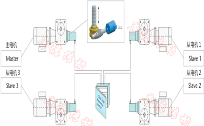 絲杆升降機與轉向器、連(lián)接(jiē)杆、聯軸器等附件組(zǔ)合,用一台電機(jī)驅動,保 證平台同步(bù)穩定運行。在(zài)無(wú)法布置(zhì)機械聯動的工(gōng)況中還可采用電氣控製實現聯動,以絕 對(duì)值編碼器以及(jí)PLC控製來實現同步定位精度。