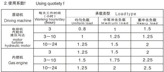 式中P1N為選型功率,P1為實際需要的功率,f為使用係數,PN為許用功率。