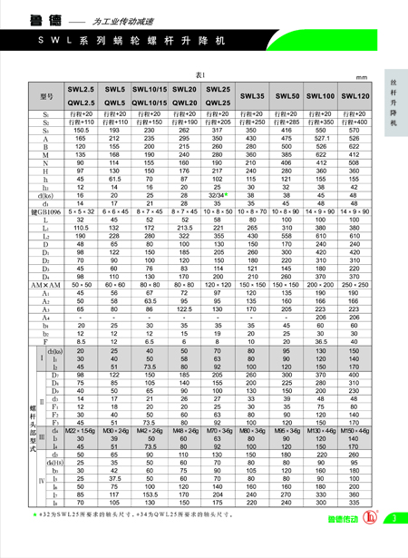 SWL係列蝸輪螺杆升降機,蝸輪絲杆升(shēng)降機有不同的結構型式和裝(zhuāng)配方式,提升高(gāo)度可按要求加工製造。請根據實際使用負(fù)荷(hé)、螺杆行程和起升速度選擇合適(shì)的絲杆升降機。