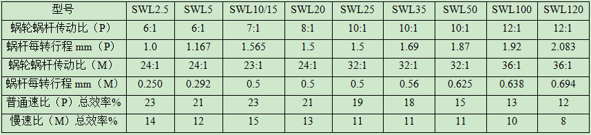 蝸輪絲杆升(shēng)降機的速比有快速和(hé)慢速兩種(zhǒng),快速普通(tōng)速比(P)為6:1,每分鍾行(háng)走速度為1670mm;慢速為24:1,每分(fèn)鍾行走(zǒu)400mm。在同一個型號下(xià)的絲杆升降機,普通速比的傳動要比慢速的小,蝸杆的每轉要(yào)比慢速的長一些,慢(màn)速的絲杆升降機在總效率上比不上普通(tōng)速比(bǐ)的