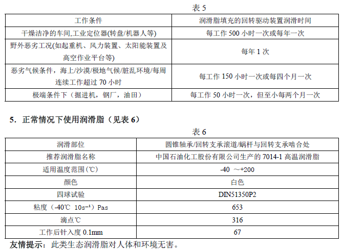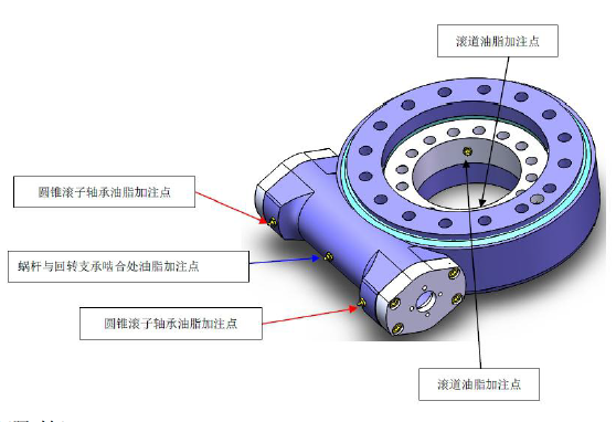 減速機有三處需要保持(chí)潤(rùn)滑,分別為:回轉支承滾道、蝸杆與回轉尺寸(cùn)齧合處和(hé)圓錐滾(gǔn)子軸承,潤滑間隔時間根據實際工作條件決定。