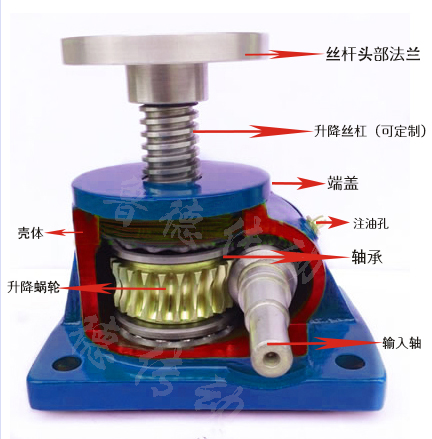 絲杆升降機由電機或者(zhě)手動驅動蝸杆旋轉,蝸(wō)杆驅動蝸輪減速旋轉,蝸輪內腔加工為內螺紋,驅動絲(sī)杠上(shàng)下(xià)移動,由於內部有蝸(wō)輪蝸(wō)杆,絲杠的減速作用,達到放大推力的(de)作用。17C(dé)傳動加工