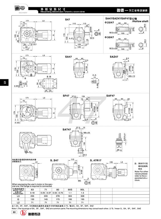 S47可配電機功率為0.18KW~1.5KW;速比11.46~244.74;結構型(xíng)式有軸裝式A、軸伸法蘭式F、軸裝(zhuāng)法蘭式AF、軸裝小法蘭式AZ、軸裝帶防轉臂式AT;