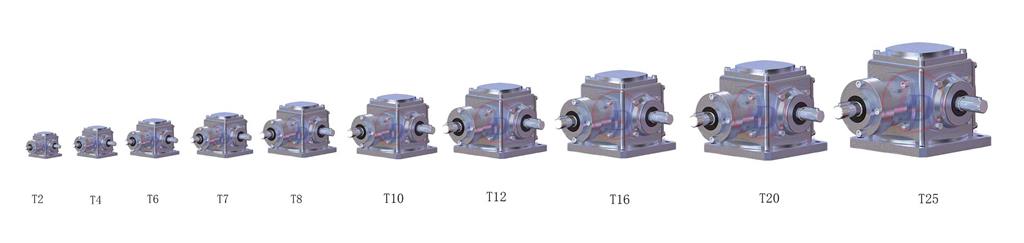 錐齒輪轉向箱,T係列螺旋錐齒輪傳動箱,標準化,多品種,速比(bǐ)1:1、1.5:1、2:1、2.5:1、3:1、4:1、5:1全部為實際傳(chuán)動(dòng)比。平均效率98%。有單軸、雙黃軸(zhóu)、單縱軸、雙縱軸可選。螺旋錐齒輪可以(yǐ)正反運轉,低速或高速傳動平穩,而且(qiě)噪(zào)音低,振動小,承受力大。